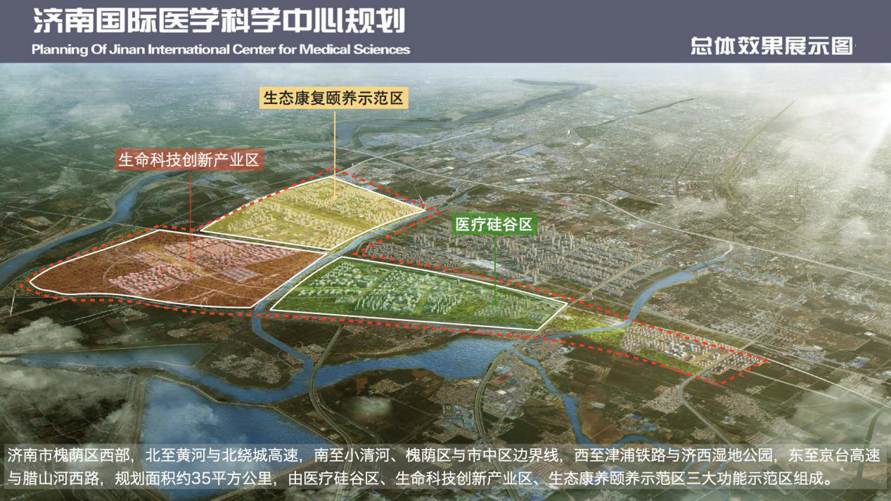 濟南國際醫(yī)學(xué)科學(xué)中心位于濟南市槐蔭區(qū),規(guī)劃面積約35 平方公里,是山東省政府主導(dǎo)、濟南市政府具體實施的重大健康產(chǎn)業(yè)項目,是省市貫徹落實健康中國戰(zhàn)略的重大舉措,是全市新舊動能轉(zhuǎn)換、黃河流域生態(tài)保護和高質(zhì)量發(fā)展的標志項目。
